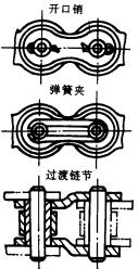 為了使鏈聯(lián)成封閉環(huán)狀,鏈的兩端應(yīng)用聯(lián)接鏈節(jié)聯(lián)接起來,聯(lián)接鏈節(jié)通常有三種形式(見圖8–4)。當(dāng)組成鏈的總鏈節(jié)為偶數(shù)時,可采用開口銷或彈簧夾將接頭上的活動銷軸固定。當(dāng)鏈節(jié)總數(shù)為奇數(shù)時,可采用過渡鏈節(jié)聯(lián)接。鏈條受力后,過渡鏈節(jié)的鏈板除受拉力外,還受附加彎矩,其強(qiáng)度較一般鏈節(jié)低。所以在一般情況下,最好不用奇數(shù)鏈節(jié)。