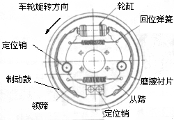 在轎車制動鼓上,一般只有一個輪缸,在制動時輪缸受到來自總泵液力后,輪缸兩端活塞會同時頂向左右制動蹄的蹄端,作用力相等。但由于車輪是旋轉的,制動鼓作用于制動蹄的壓力左右不對稱,造成自行增力或自行減力的作用。因此,業內將自行增力的一側制動蹄稱為領蹄,自行減力的一側制動蹄稱為從蹄,領蹄的摩擦力矩是從蹄的2~2.5倍,兩制動蹄摩擦襯片的磨損程度也就不一樣。