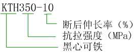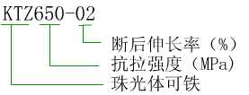 [牌號表示方法]:可鍛鑄鐵的牌號是由“KTH”(“可鐵黑”三字漢語拼音字首)或“KTZ”(“可鐵珠”三字漢語拼音字首)后附最低抗拉強度 值(MPa)和最低斷后伸長率 的百分數表示。例如牌號KTH 350—10表示最低抗拉強度 為350 MPa、最低斷后伸長率 為10%的黑心可鍛鑄鐵,即鐵素體可鍛鑄鐵;KTZ 650—02表示最低抗拉強度 為650 MPa、最低斷后伸長率 為2%的珠光體可鍛鑄鐵。