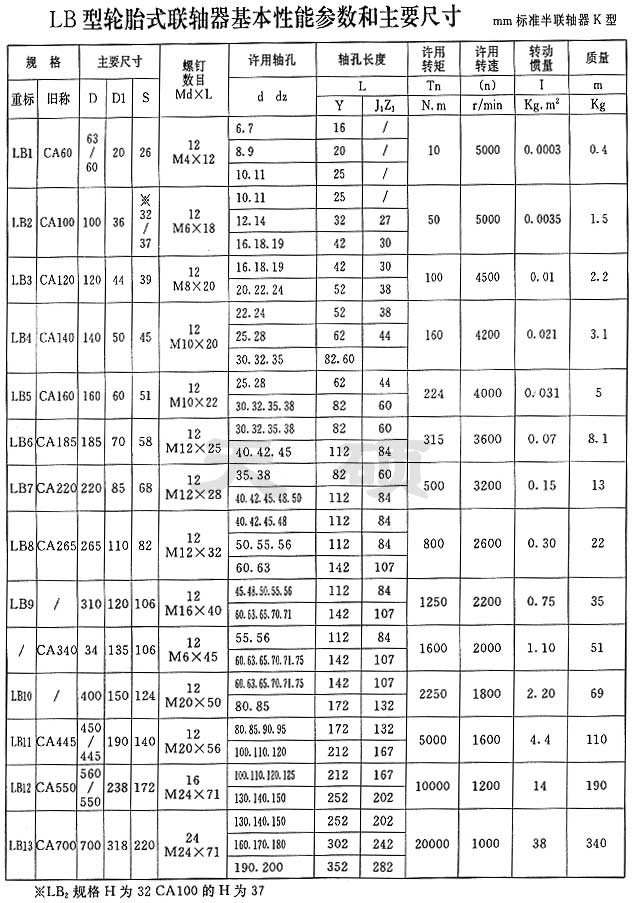 LLB型輪胎式聯(lián)軸器基本性能參數(shù)和主要尺寸