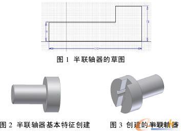 零件是特征的集合,設計零件的過程就是創建每一個特征的過程。在inventor10中,主要包括草圖特征、放置特征、定位特征、草圖特征是從草圖幾何圖元來創建特征如拉伸、旋轉和打孔等特征。有一些特征在指定參數后,選擇零件中的某些位置后就可創建出來.這種不依賴草圖的幾何特征稱為放置特征。如圓角、倒角、抽殼、拔模斜度、陣列、鏡像和螺紋特征等定位特征一般用于在幾何圖元不足以創建特征時。為特征的創建提供必要的幫助,本身不能用來創建特征,包括工作軸、工作面和工作點。半聯軸器的創建,首先,在二維草圖環境中利用草圖工具繪制半聯軸器的草圖,如圖1所示。其次,在零件特征環境中利用旋轉和倒圓角等工具創建如圖2的半聯軸器,其上的孔、鍵槽和凹槽的創建可以采用類似的方法和步驟,利用零件特征環境中拉伸工具等可以創建,最終模型如圖3所示。