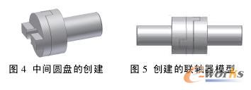 將繪制好的半聯軸器裝入到部件環境中,系統會自動把它作為固定件。在部件環境中在位創建零件,單擊部件面板上的創建零部件工具,選擇半聯軸器的凹槽端面作為草圖平面,回到草圖環境中利用二維草圖面板上的投影幾何圖元工具,將光標放在聯軸器與中間圓盤結合處系統會自動感應到相應的輪廓,把有關輪廓投影到草圖平面上來,然后回到特征環境中通過拉伸等工具建立中間圓盤的模型,如圖4所示,這也就是基于實裝配關系來創建的零件,這樣系統就會自動建立一個表面平齊的裝配約束,中間圓盤就與半聯軸器在形狀和尺寸是相關的,當半聯軸器的結構和尺寸發生改變時,基于裝配上的相關性,中間圓盤結構和尺寸亦會發生相關的改變,它就是所謂的自適應零件。