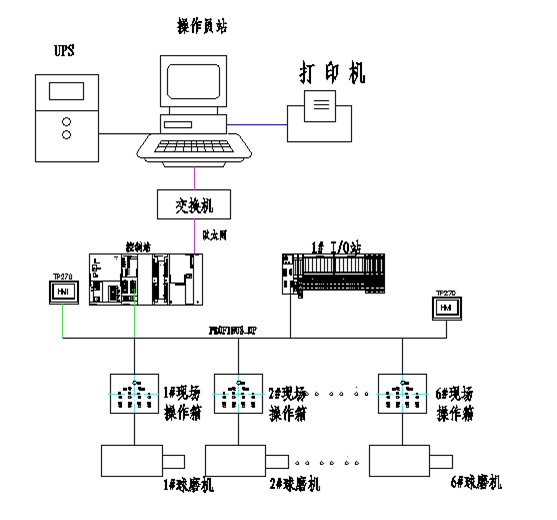由于現場的的6臺球磨機分別放置在兩個房間, I/O點相對比較分散,因此設計的監控系統有監控計算機(上位機)、通訊連接網絡、下位機PLC+I/O、現場操作箱、球磨機組成。系統結構圖1所示: