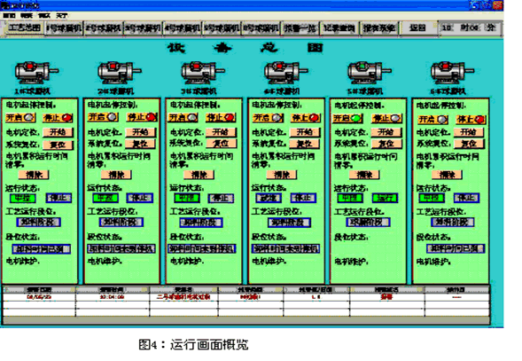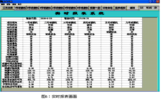 采用研華IPC-610H工控機,以中文Windows XP為操作平臺,充分利用WINDOWS系統的圖形功能;組態軟件采用北京亞控組態王V6.53,設計出操作簡單、直觀方便的人機界面。監控畫面主體為一個總貌圖,6個分畫面和若干輔助畫面(如記錄顯示畫面、報警一覽畫面、報表系統等)。功能包括:顯示所有球磨機的運行狀態、設定時間、所處的工藝階段(球磨、卸料、歸位等)、實時報警信息、操作按鈕、授權登錄操作、單臺球磨機的全部信息等。如下圖4、5、6所示:
