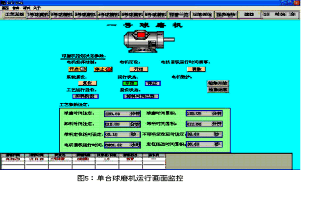 (2)上控機上設有6臺球磨機的啟動、停止按鈕,當按鈕有動作時能相應地顯相應按鈕的狀態。顯示總球磨時間、當前已用時間、剩余時間、球磨次數等。
