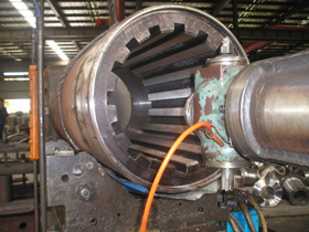 以銑代插大型聯軸器花鍵套專用機床 備技術參數:數控DTK系統四軸聯動,采用先進的滾動導軌、滾珠絲桿,高精度回轉工作臺,最大直徑內孔1500mm,最大切削長度1200mm,機床精度6級。