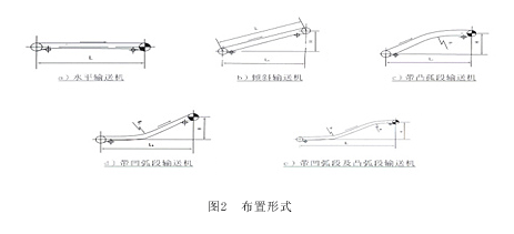 1、氣墊帶式輸送機的布置形式如圖2所示五種。既能水平輸送,亦可傾斜輸送,傾斜向上輸送和傾斜向下輸送時,不同物料所允許的最大傾角β,可參見TD75帶式輸送機選用手冊。