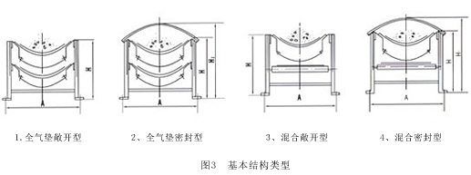 4、氣墊帶式輸送機的基本結構形式有:I、全氣墊敞開型,II、全氣墊密封型,III、混合敞開型,IV、混合密封型等四種,詳見圖3。布置尺寸參見表2-1。頭架、尾架、張緊裝置、驅動架、中間支架的選用,均可采用TD75帶式輸送機設計手冊有關參數。
