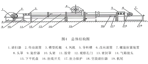 圖4所示是混合氣墊帶式輸送機總體結構簡圖(若是全氣墊帶式輸送機,則序號15換成下氣箱即可),選型計算時,僅把氣箱段的運行阻力系數取用ω氣=0.008~0.012即可,其余計算參照TD75通用托輥輸送機計算公式。