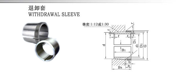 退卸套對裝在軸端,經常拆卸、規格較大的圓錐孔軸承(調心球軸承,調心滾子軸承,雙列圓柱滾子軸承)裝拆維修特別方便,廣泛用于輕工、冶金、軋機等機械設備上。 |