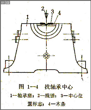 無論是單個的電機軸承和機組的多軸承,都應當安裝在被聯接的機械主縱軸線上或者機組的縱軸線上。測量軸承中心是用掛鋼絲和線錘的方法檢查如圖1─4所示。(軸承圓弧內卡一木條,在木條中心釘一薄鐵條,標志中心位置)。